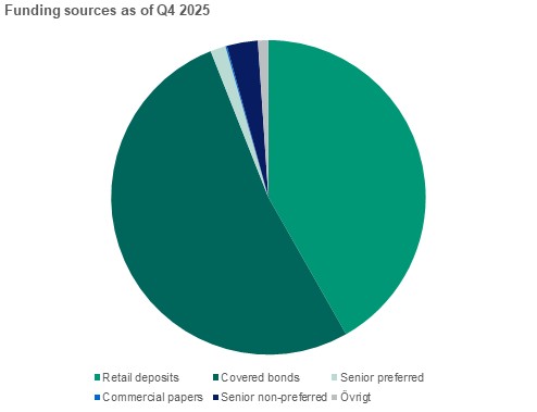 A majority of the assets are funded via retail deposits. The remaining part is, to a large extent, funded via the capital markets. Skandiabanken issues only SEK denominated bonds or commercial papers. Most of the funding raised via the capital markets comes from Floating Rate Notes (FRN).